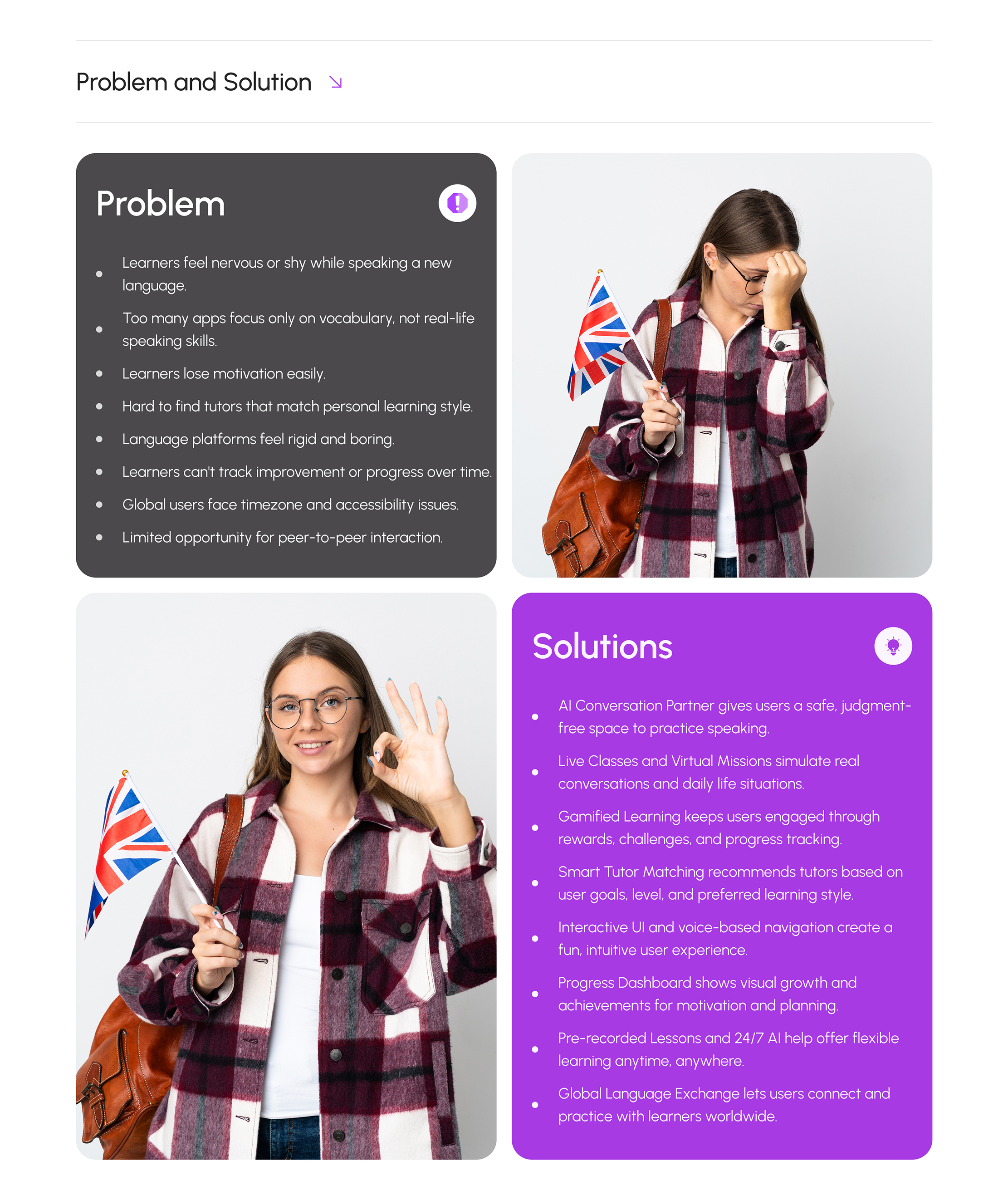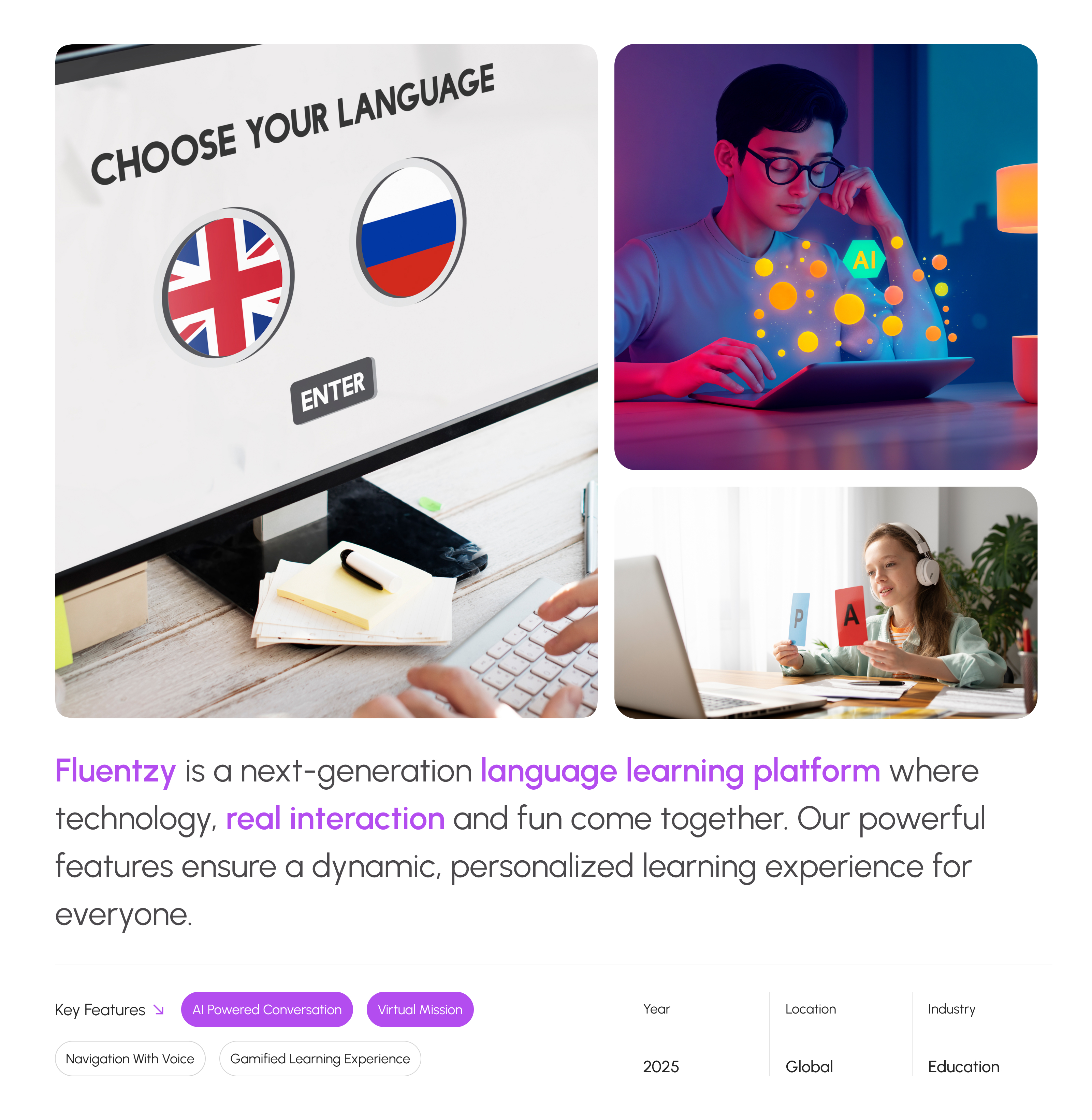Fluentzy is a next-generation language learning platform where technology, real interaction and fun come together. Our powerful features ensure a dynamic, personalized learning experience for everyone. An intelligent virtual assistant that helps users practice speaking anytime, without the pressure of a real audience. Designed to simulate real-life conversations, this feature allows learners to build fluency and confidence.