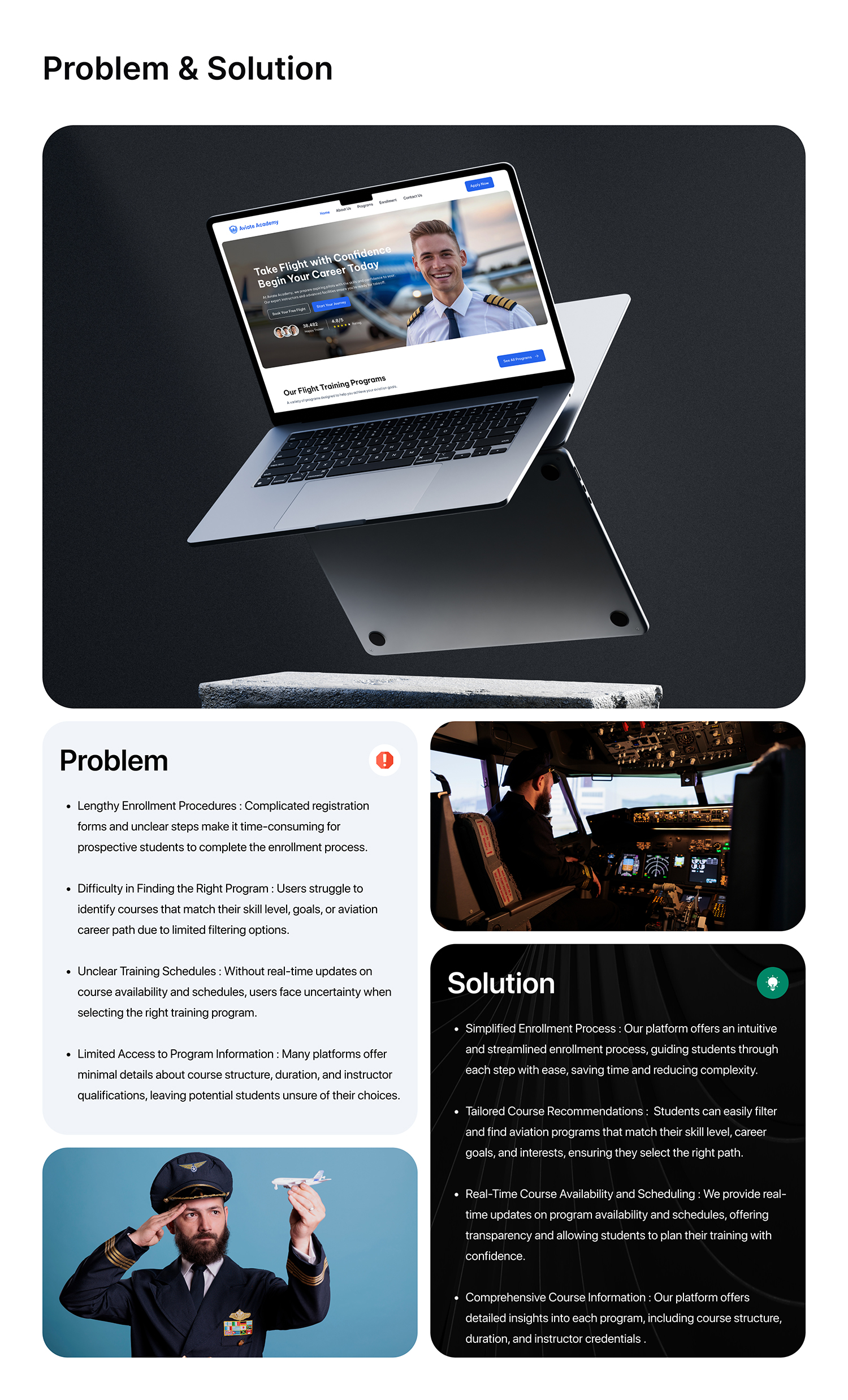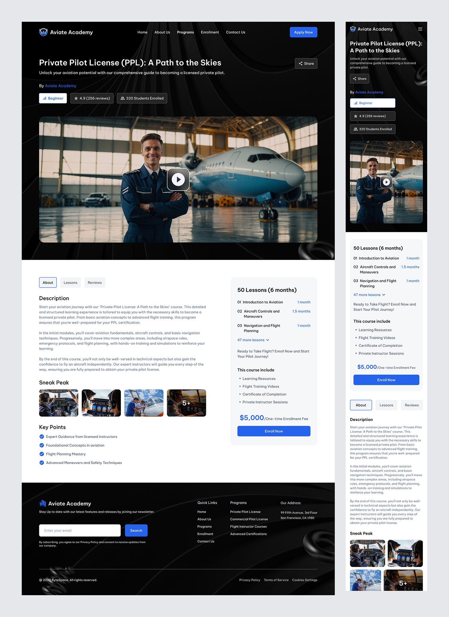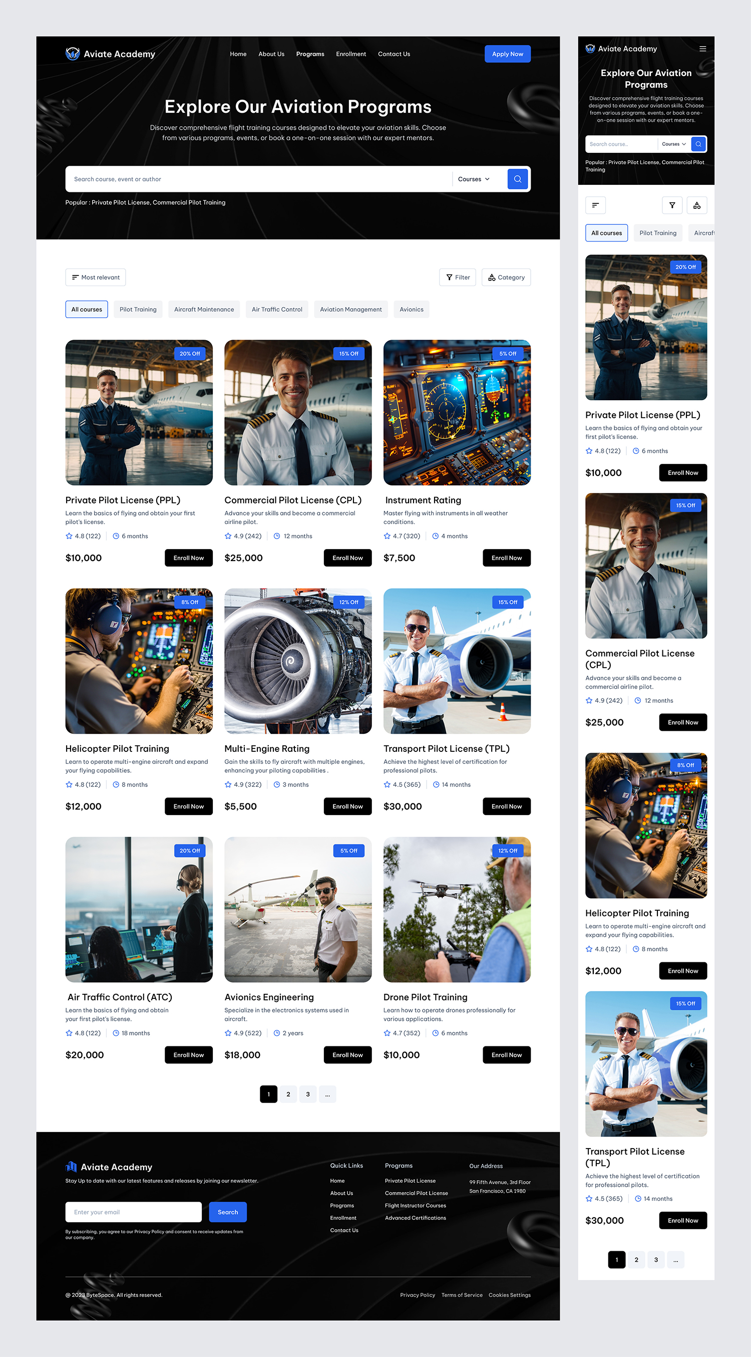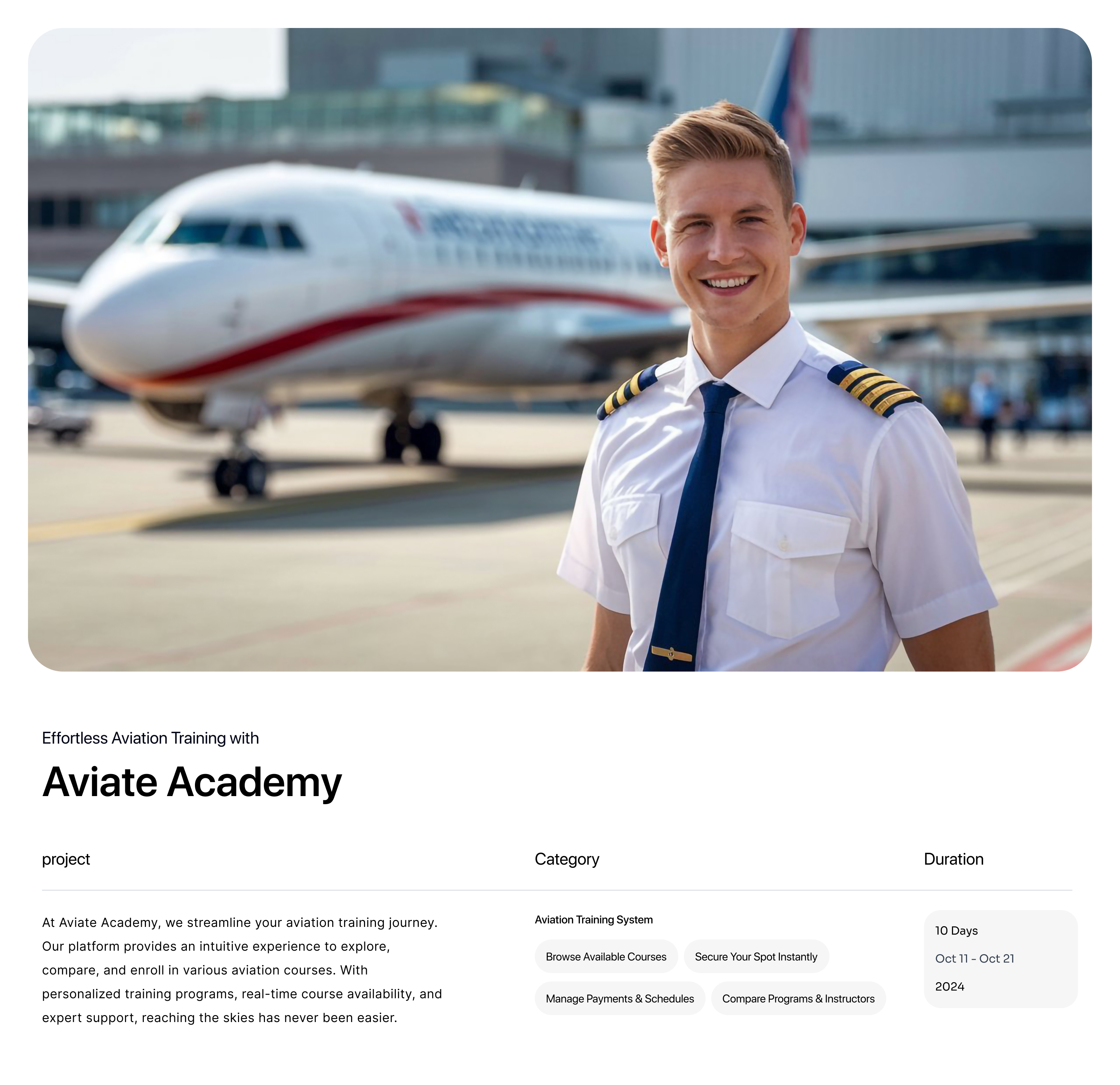 At Aviate Academy, we streamline your aviation training journey. Our platform provides an intuitive experience to explore, compare, and enroll in various aviation courses. With personalized training programs, real-time course availability, and expert support, reaching the skies has never been easier.