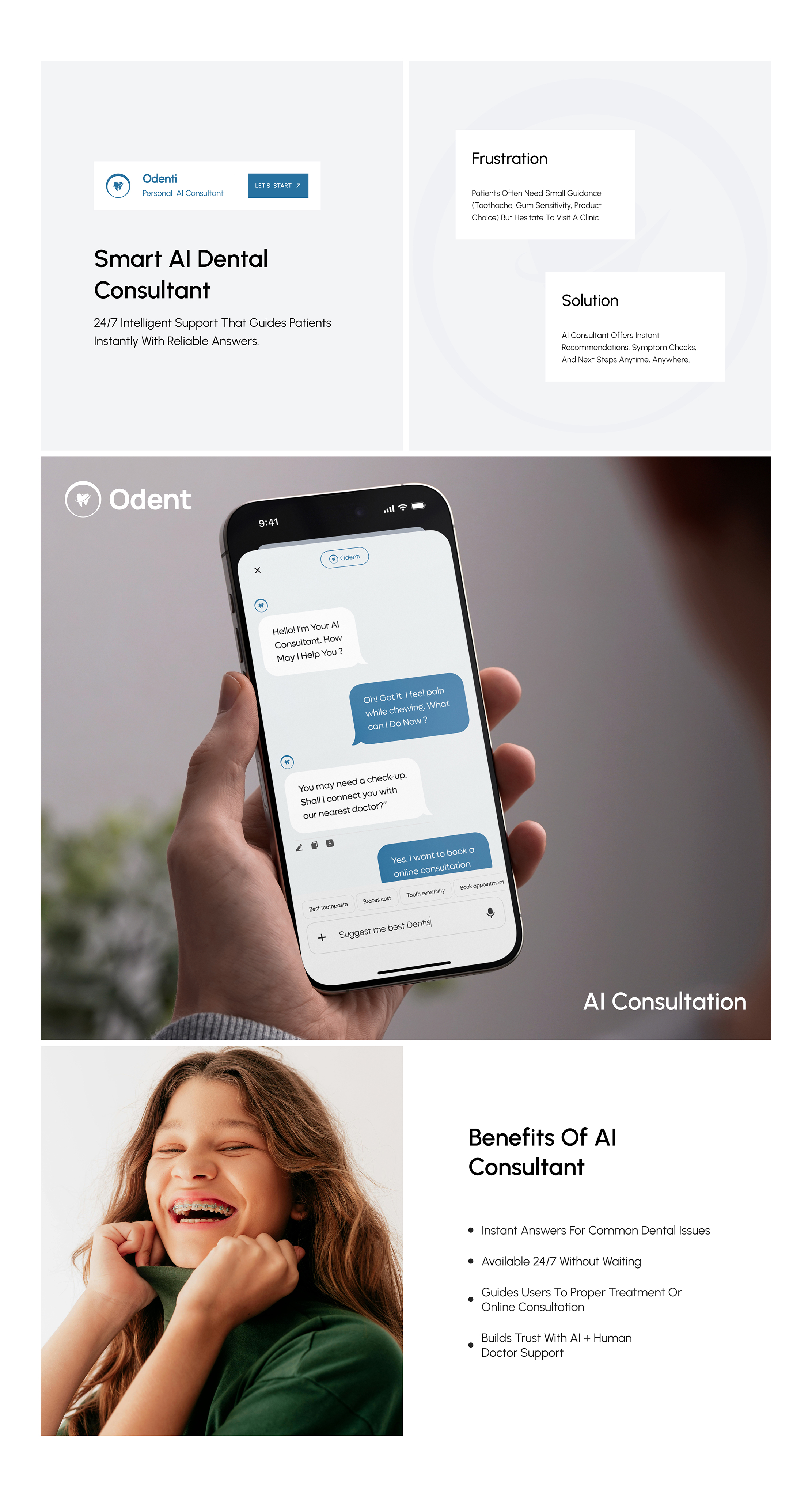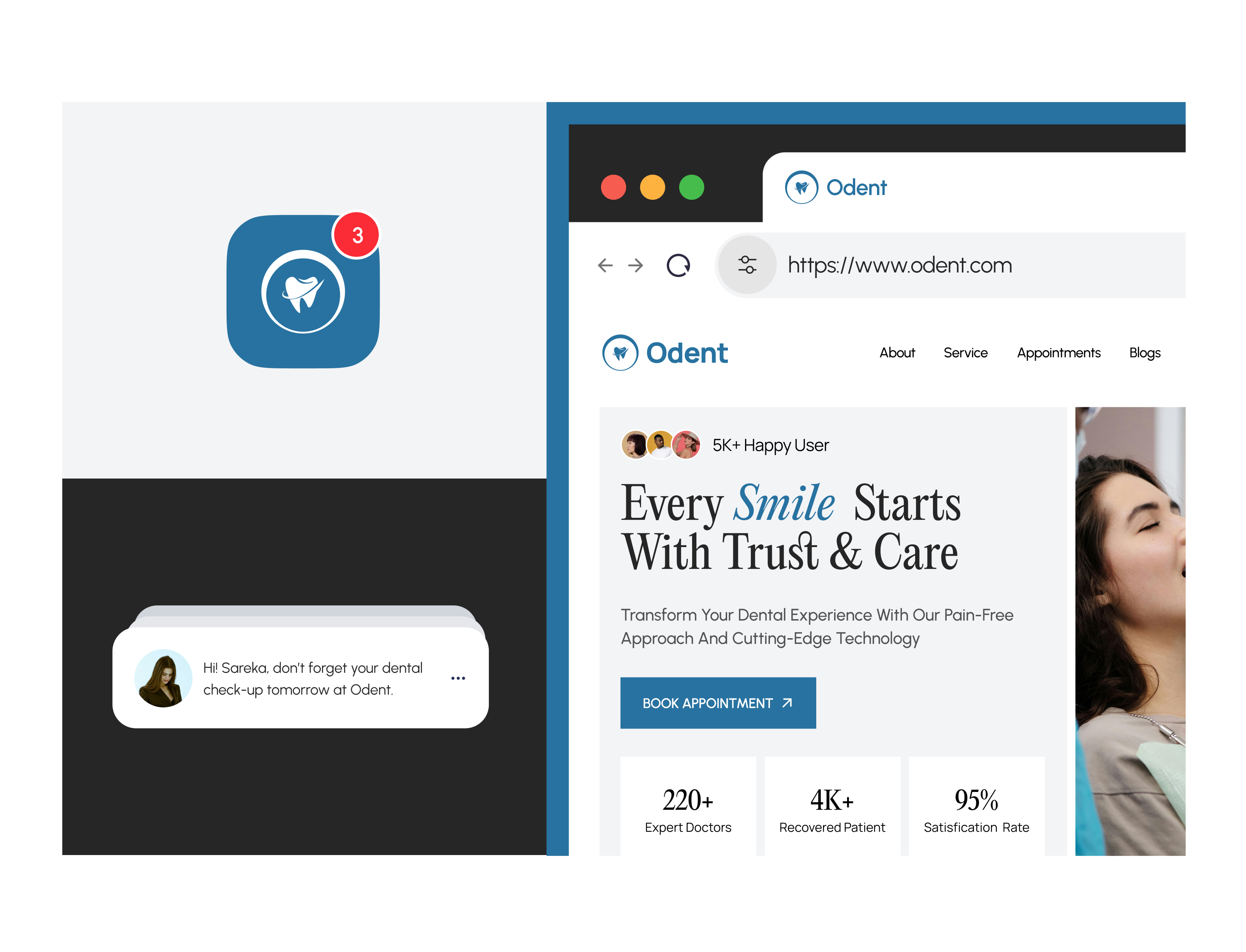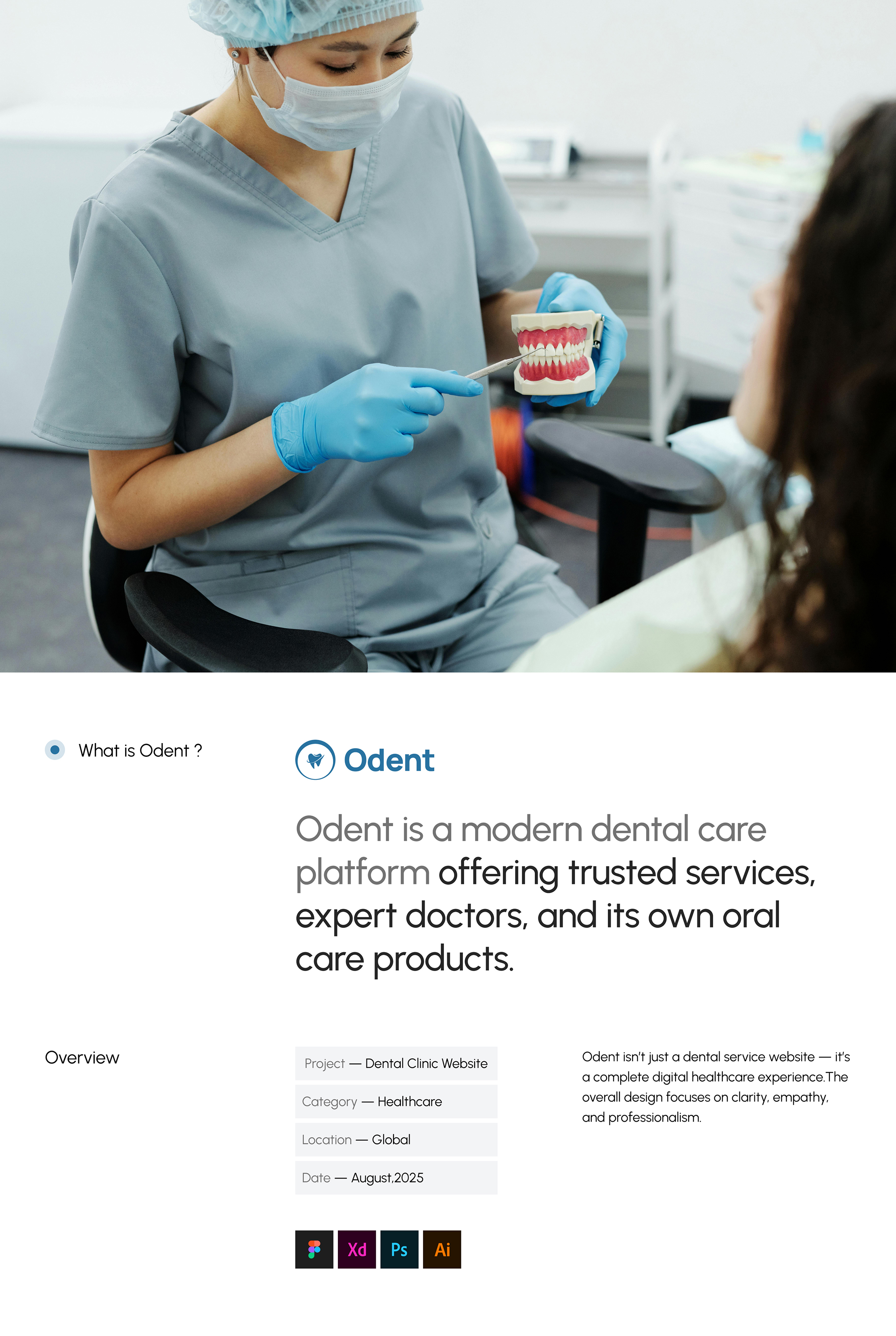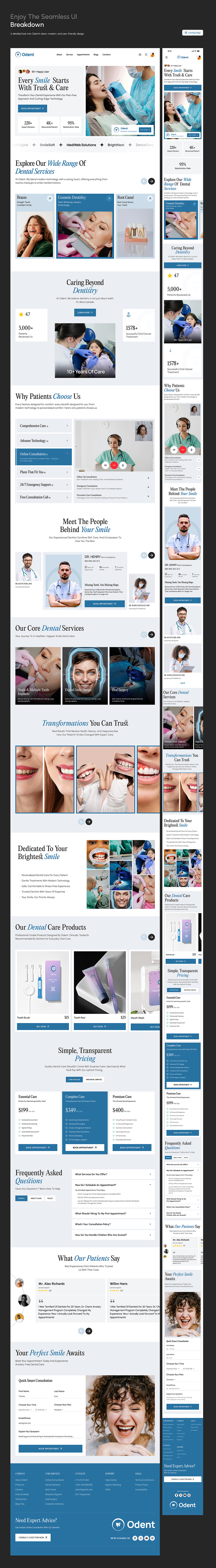 Odent is a modern, human-centered dental care platform that combines trusted dental services, experienced professionals, and a unique line of oral care products under one seamless digital experience. Unlike traditional dental service websites, Odent positions itself as a complete healthcare ecosystem, bridging the gap between clinical expertise and everyday oral wellness. The design approach focuses on clarity, empathy, and professionalism, ensuring users feel comfortable and confident while navigating the platform. Odent’s UI highlights key user needs—from booking appointments with expert doctors to exploring tailored oral care solutions—presented in an accessible and trustworthy manner. The result is a platform that not only streamlines access to dental care but also builds a brand identity rooted in care, reliability and innovation.