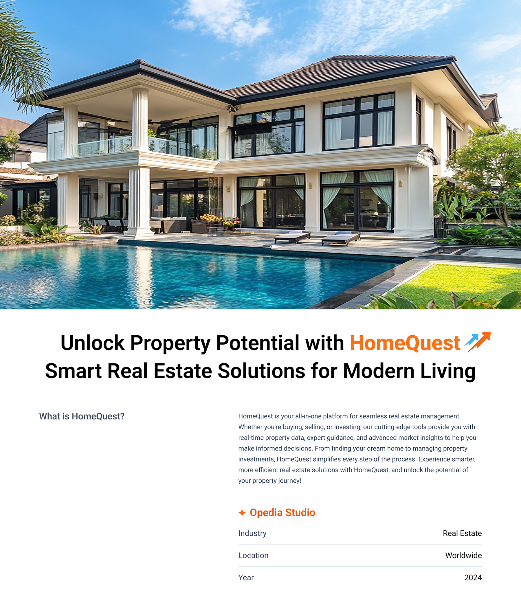 HomeQuest is your all-in-one platform for seamless real estate management. Whether you're buying, selling, or investing, our cutting-edge tools provide you with real-time property data, expert guidance, and advanced market insights to help you make informed decisions. From finding your dream home to managing property investments, HomeQuest simplifies every step of the process. Experience smarter, more efficient real estate solutions with HomeQuest, and unlock the potential of your property journey!