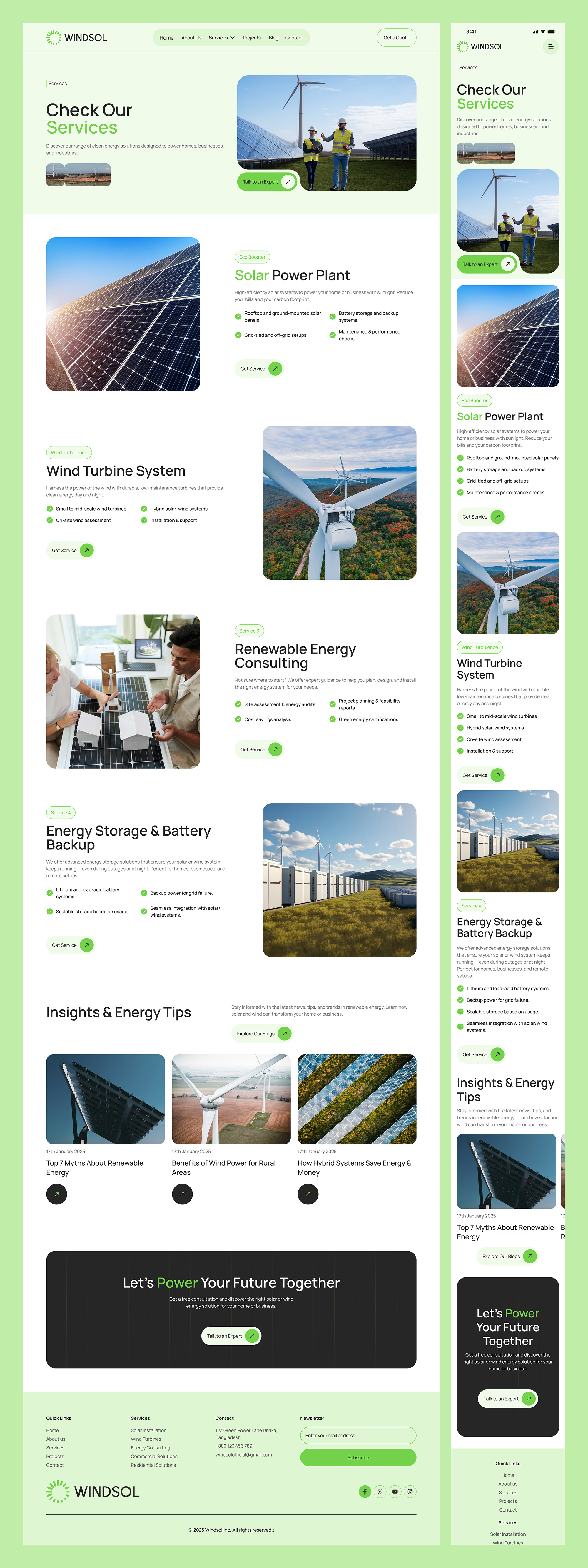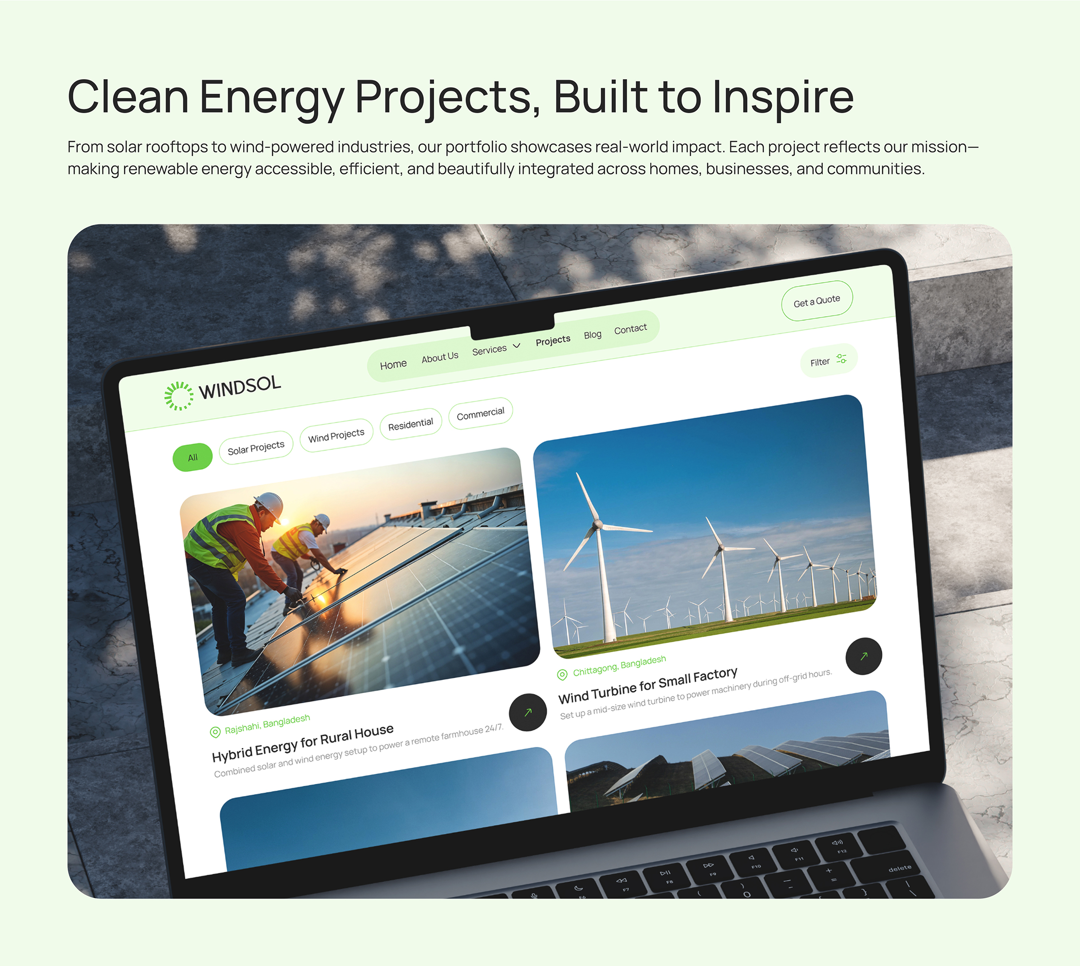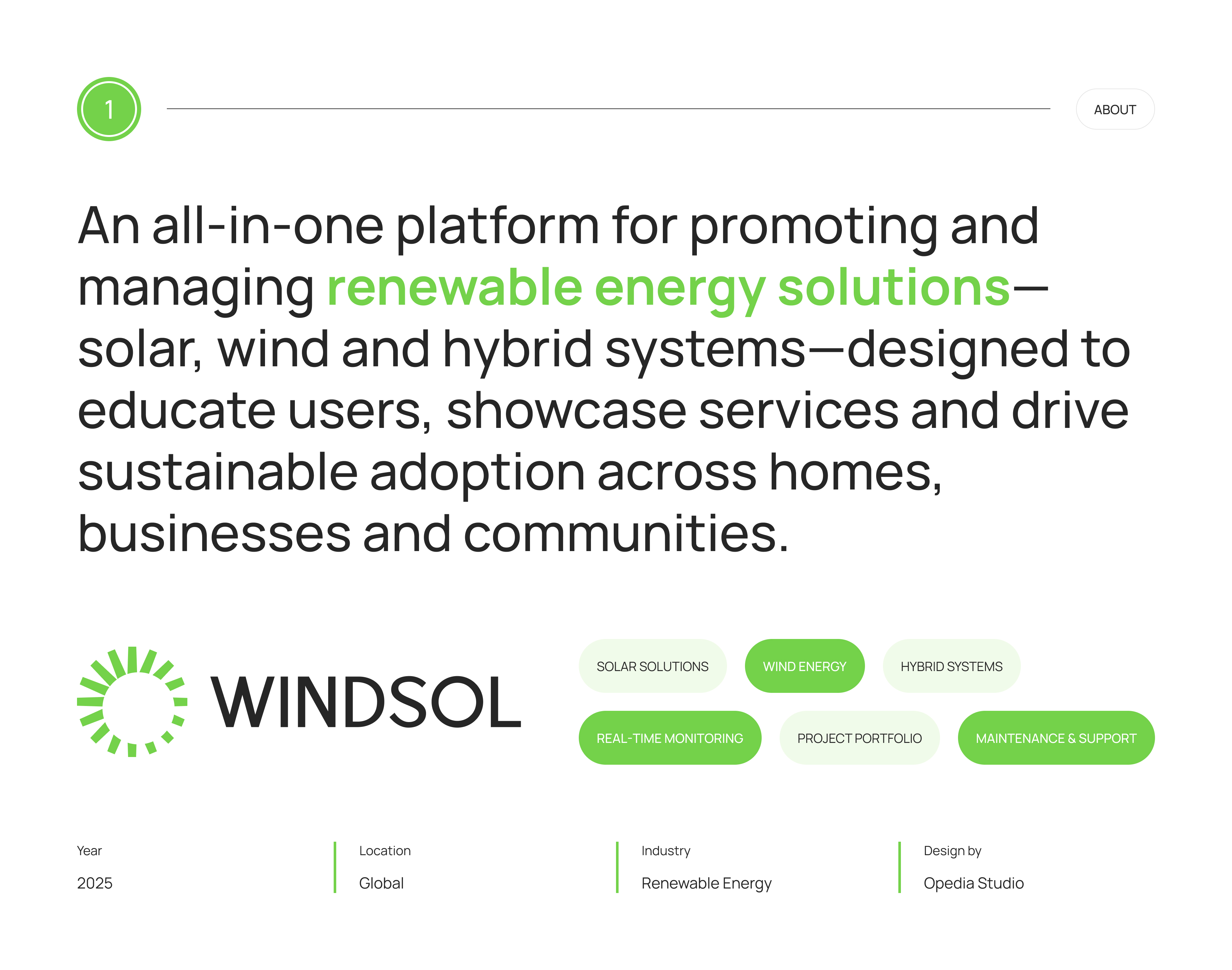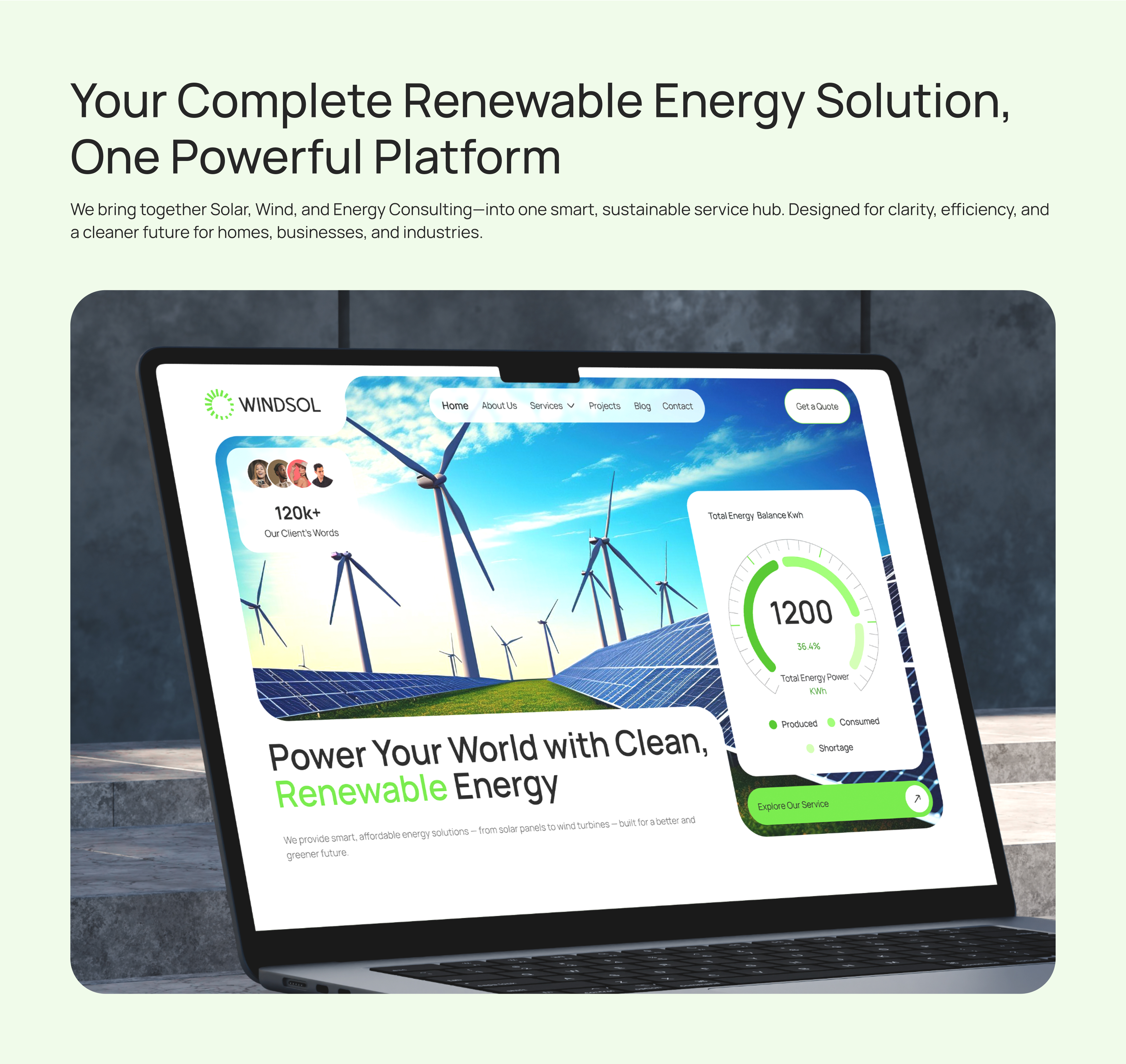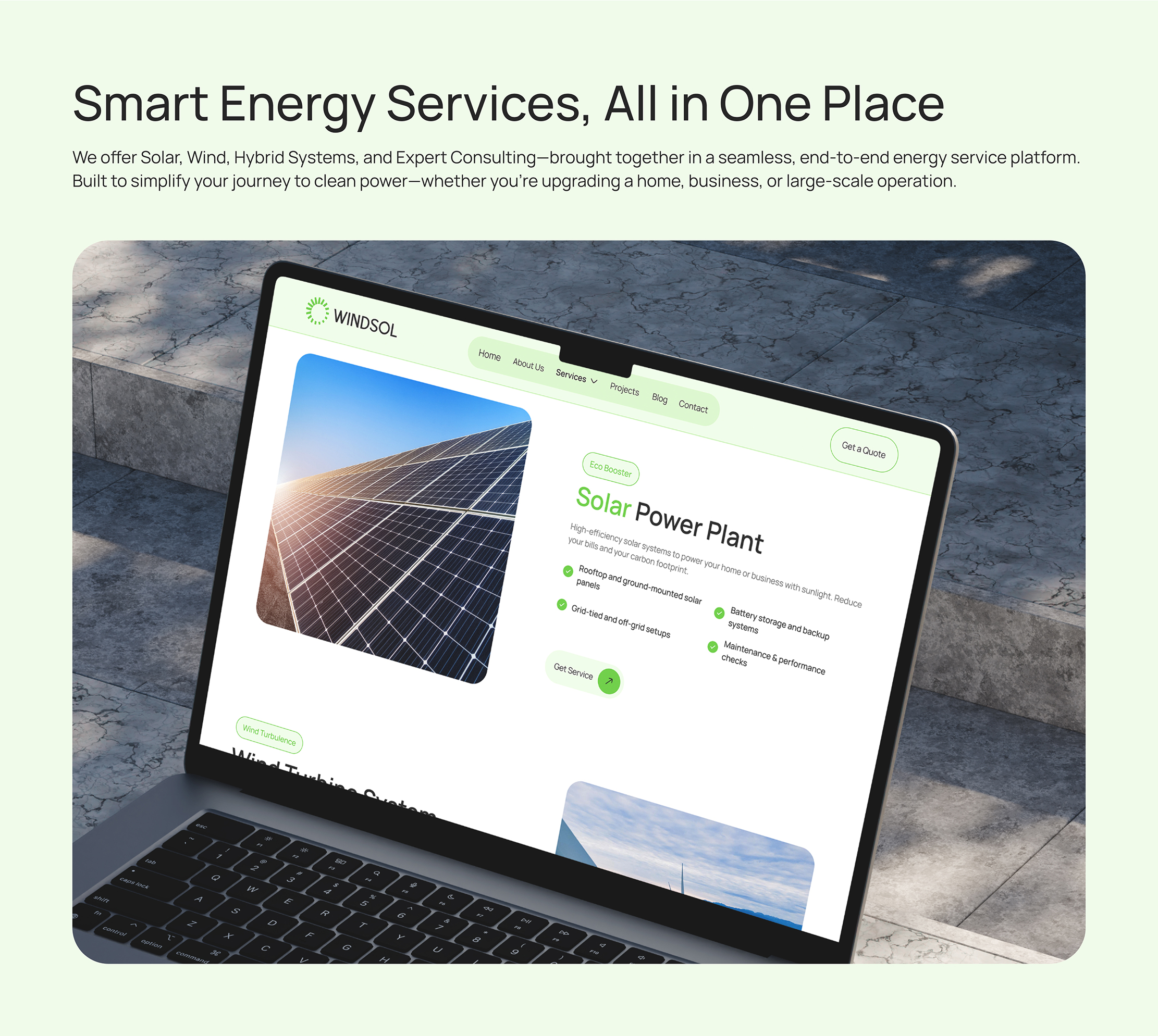 An all-in-one platform for promoting and managing renewable energy solutions—solar, wind and hybrid systems—designed to educate users, showcase services and drive sustainable adoption across homes, businesses and communities. We bring together Solar, Wind, and Energy Consulting—into one smart, sustainable service hub. Designed for clarity, efficiency, and a cleaner future for homes, businesses, and industries.